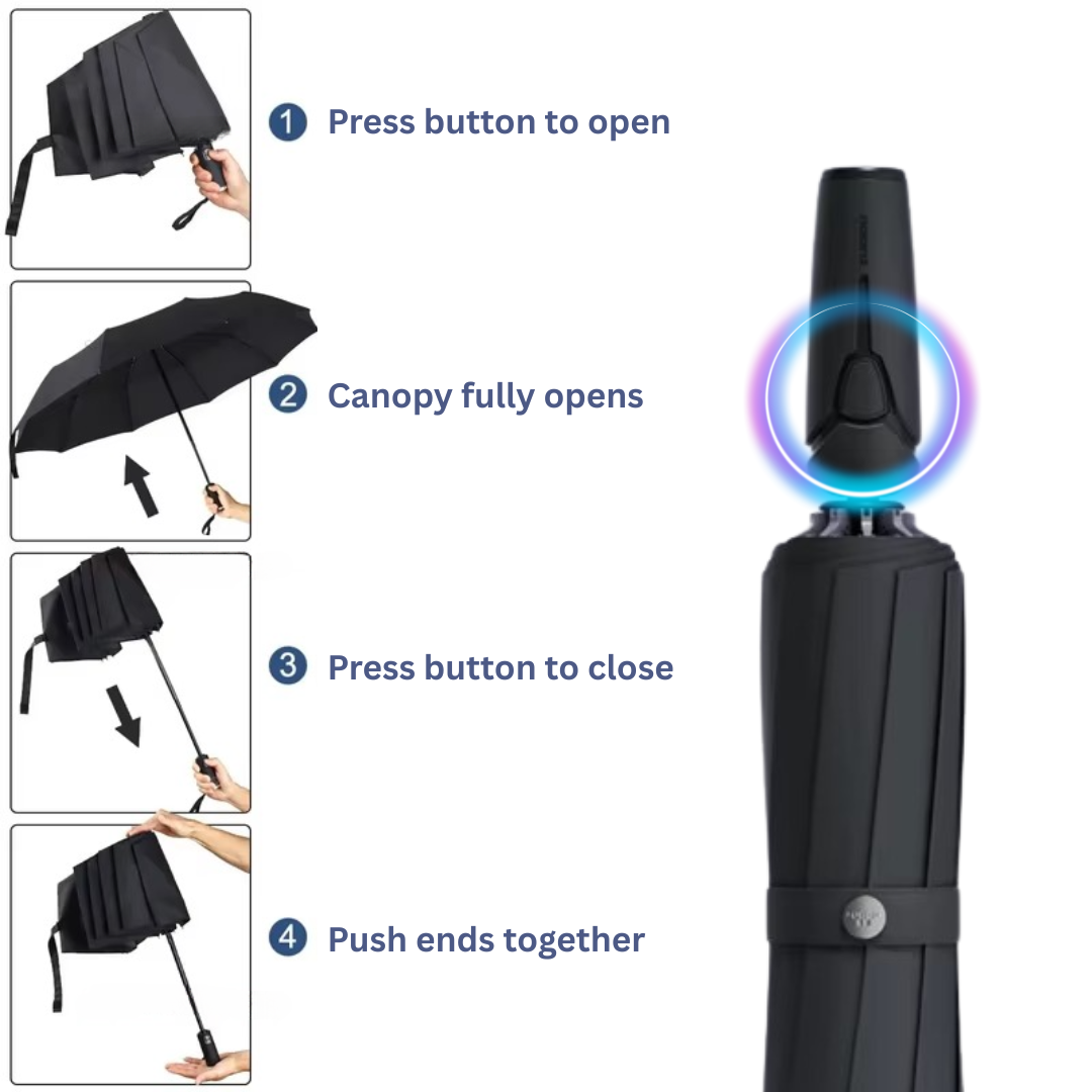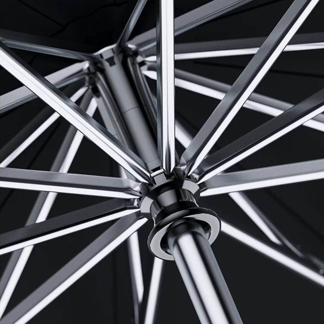 The Brellux Prime's engineered rib system is designed to flex under pressure rather than fail, distributing force evenly to resist inversion and maintain flawless stability in harsh winds.
